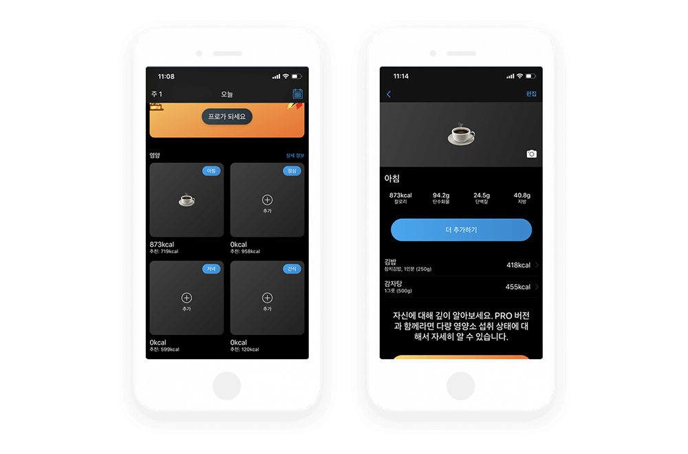 메인의 요약화면은 최초가입했을때 입력했던 현재 몸무게와 목표몸무게를 분석해서 하루동안의 총칼로리와 먹은 음식 칼로리의 정보를 보여줘요. 탄수화물, 단백질, 지방의 수치를 보여주기 때문에 식사관리를 하는 다이어터들에게 좋을거 같아요.