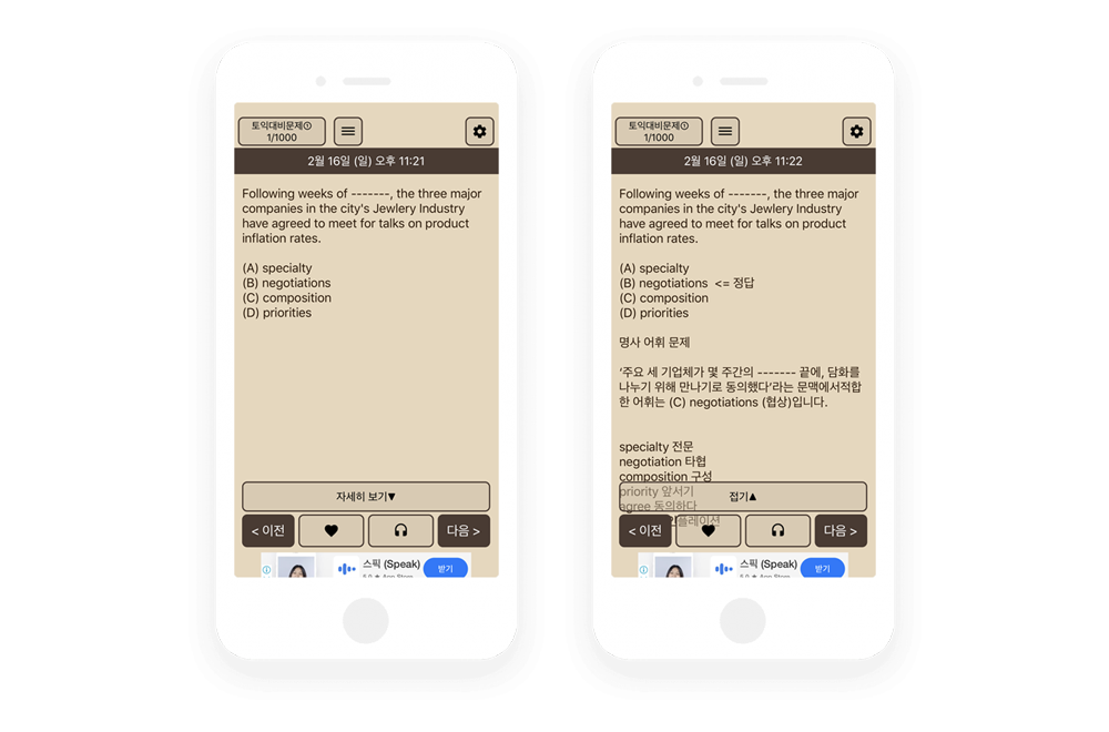 혹시 영화 ‘친구’에서 영어선생님이 매우 한국적인 발음으로 영어수업을 하는 장면을 기억하시나요? 영어단어를 공부할때 단어의 의미를 아는것도 중요하지만 발음도 중요하죠. 영어관련어플에는 기본적으로 원어민의 발음을 확인할수 있는데 '켜자마자영단어'에서도 해당 영단어 발음을 확인할수 있어요. 물론 미국식 발음과 영국식 발음중에 선택할수 있어요. 특히 발음의 속도를 조절할수 있어서 느린속도로 발음을 들으며 공부한 후, 빠르게 속도를 올리면 좀더 효율적이고 실생활에 도움이 될수있는 공부를 할수 있어요.