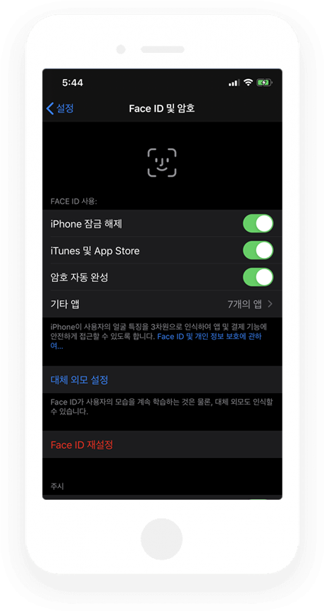 기존에는 마스크를 착용하면 얼굴 인식 자체가 되지 않고, 암호 입력 화면도 페이스아이디 인식을 수차례 시도해야 넘어가는데, 마스크를 쓰고 있을 때 잠금 화면 하단의 바를 위로 올리면 암호 필드가 자동으로 표시되도록 개선했어요. 또한 잠금화면 뿐만 아니라 페이스아이디 로그인을 지원하는 애플 내의 앱스토어, 애플북스, 아이튠즈 등에도 설정 < 페이스ID 및 암호 < 아이폰 잠금 해제하면 페이스아이디 대신 암호 입력으로 변경할 수 있어요.