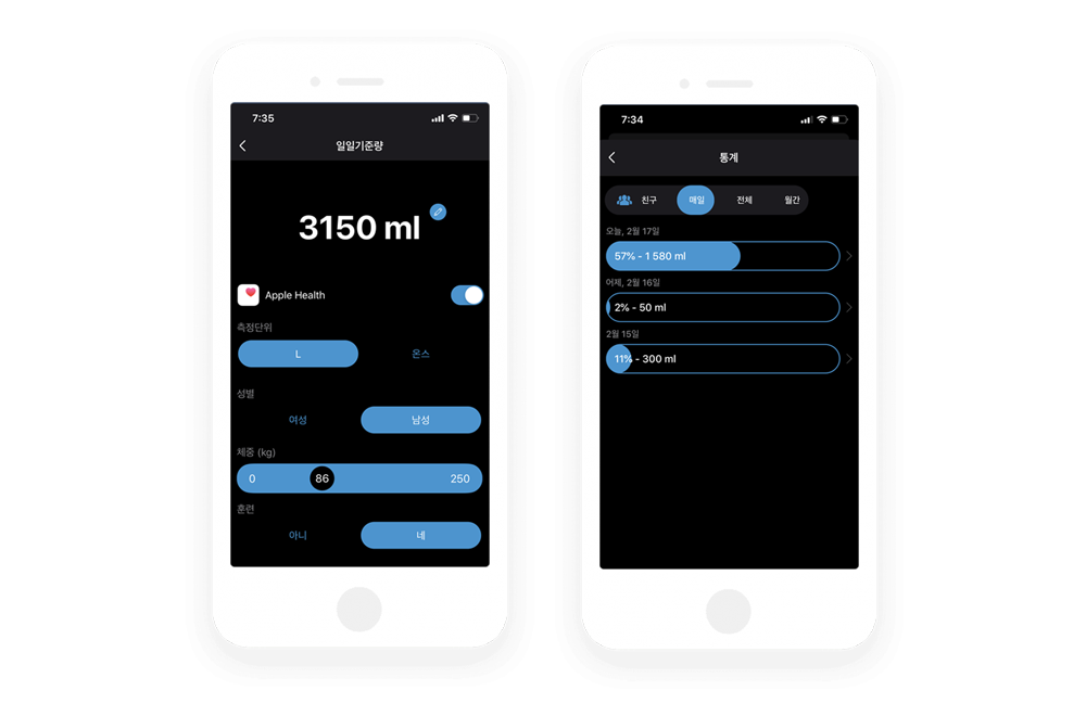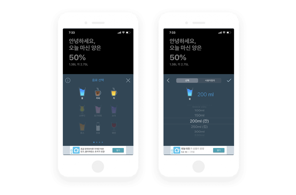 어플을 실행하면 먼저 자신의 신체정보를 입력을 해야 해요. 성별과 몸무게, 현재 운동을 하는지를 체크해서 하루 섭취량을 알려줘요. 화면은 현재 설정된 전체 물섭취량과 현재 물섭취량을 보여주고, 음료추가 버튼을 눌러서 물의 섭취량을 선택하면 기록이 되는 방식이예요. 보통 회사나 외부에서 많이 사용하는 종이컵의 경우 가득채우면 180㎖라고 하니깐 종이컵에 담긴 물의량이라면 150㎖로 선택하는게 좋아요. 기본 설정된 알림시간 간격은 2시간인데 알림시간은 설정에서 조절할수 있어서 상황에 맞게 원하는 간격으로 조절하면 되요.
