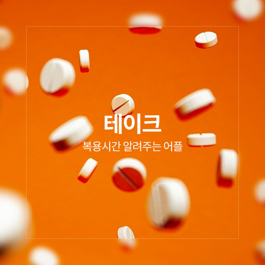약이나 건강기능식품을 여러 종류로 먹거나, 한꺼번에 많은 양을 섭취하게 되면 몸에 무리가 가서 소화장애가 발생할 수 있다고 해요. 또한 앞서 설명했듯이 약의 특성에 따라 식전이나 식후에 먹어야 하는 경우로 나누어진다고 해요. 아침, 점심, 저녁 중 언제 먹는 것이 좋은지? 식전에 먹어야 할지? 식후에 먹어야 할지? 고민인 분들에게 복용시간을 알려주는 앱 ‘테이크’는 규칙적으로 정해진 시간에 먹을 수 있게 도와주는 앱이예요.