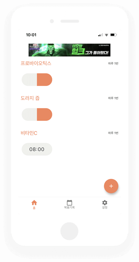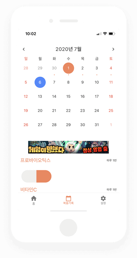 알림을 등록하면 메인화면에 등록된 건강기능식품(영양제)을 확인할 수 있어요. 알림이 울리면 알약 모양의 영양제를 터치하면 반으로 컬러가 채워지면서 복용 기록이 저장돼요.