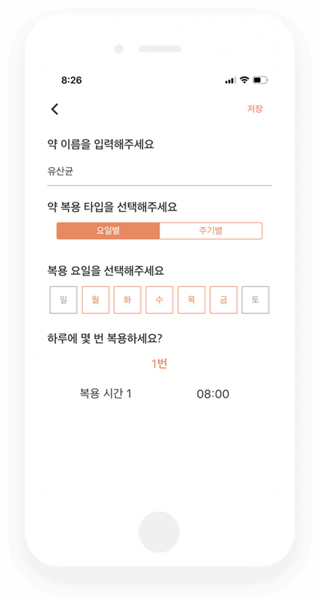 - 복용 타입 : 요일별, 주기별로 등록할 수 있어요.