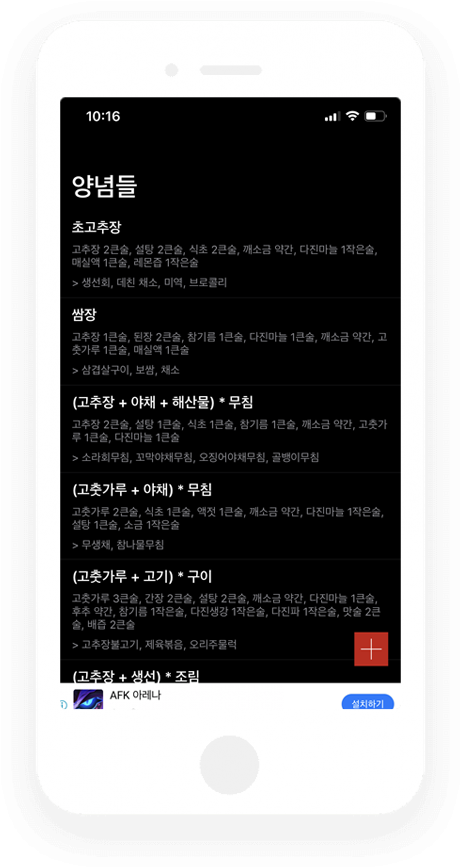 ‘양념책’은 가장 기본적인 내용을 텍스트로 보여주는 어플이예요. 이미지들이 하나도 없기때문에 심심하고 딱딱한 느낌이 들어요. 그 양념장으로 만들수있는 요리들도 설명이 없어서 어쩌면 요리레시피를 따로 찾아야하는 번거로움이 발생할수 있어요. 특히 서로의 양념장들을 공유할수 있었으면 더 좋겠지만, 아직 그런 기능은 없는거 같아서 어플의 완성도에서 아쉬움이 있어요.