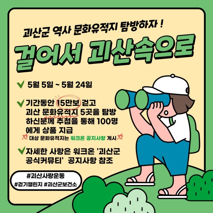 - 내용 : 괴산의 지역 중 5곳 이상, 15만보 걷기