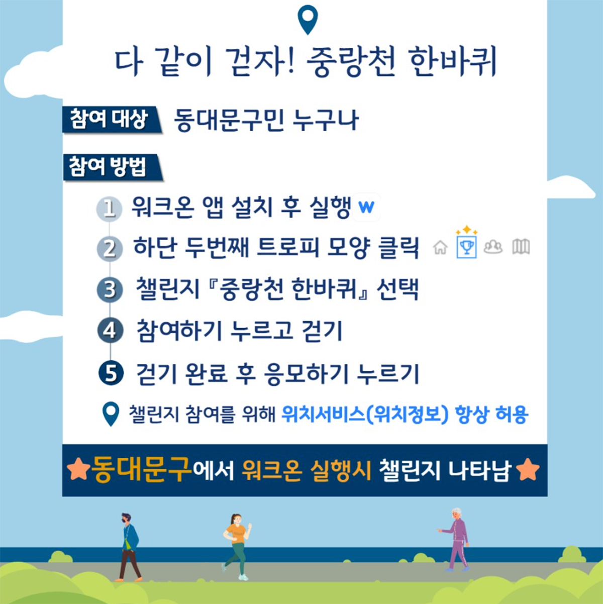 서울 동대문구에서 동대문구 주민을 대상으로 2021년 11월30일까지 ‘다 같이 걷자! 중랑천 한 바퀴’ 행사을 진행한다고 해요. 군자교~중랑교, 중랑교~군자교까지 약4km 구간을 한 달 내 완주하는 행사로 ‘워크온’을 설치 후 ‘다 같이 걷자! 중랑천 한바퀴’ 참여하기를 눌러서 완주 후 응모하기를 누르면 상품 추천 대상이된다고 해요.