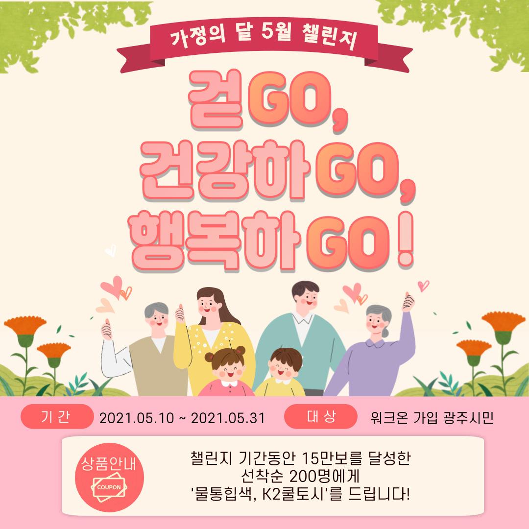 경기도 광주시는 5월 가정의 달을 맞아 5월10일~31일까지 ‘걷기GO, 건강하GO, 행복하GO’ 걷기 챌린지를 진행한다고 해요. ‘워크온’앱을 사용해서 챌린지 기간동안 15만보를 달성한 사용자들에게 선착순으로 물통힙색, K2쿨토시를 상품으로 제공한다고 해요. 참여방법은 ‘워크온’을 설치한 후 ‘광주시 워킹투게더’에 에 가입해 걷기GO, 건강하GO, 행복하GO 챌린지에 참여하기를 누르면 된다고 해요.