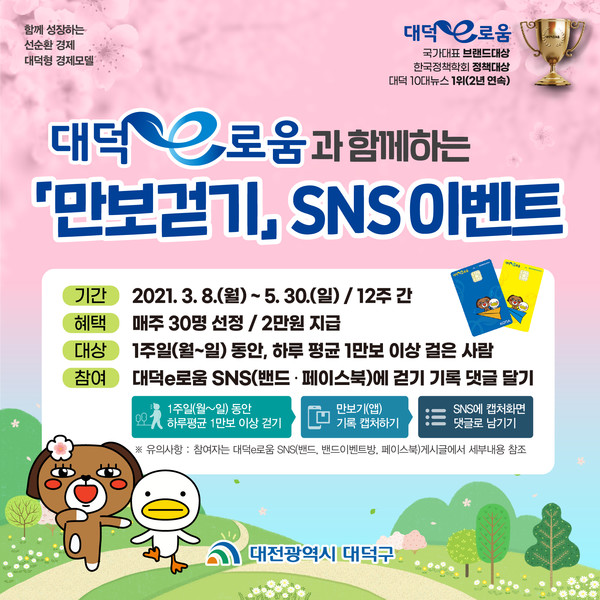 대전 대덕구는 2021년 5월30일까지 ‘만보걷기 SNS이벤트’를 진행한다고 해요. 3월8일(월)~5월30일(일)까지 12주간 진행되는 만보걷기 이벤트는 1주일(월~일)동안 하루 평균 1만보 이상 걸은 사람을 대상으로 매주 30명을 선정해서 2만원을 지급하는 이벤트라고 해요. 대덕e로움 사용자는 누구나 응모가능하고, 1주일 동안의 기록내용을 대덕e로움 SNS(페이스북, 밴드, 밴드 이벤트방)에 댓글로 올리면 된다고 해요.