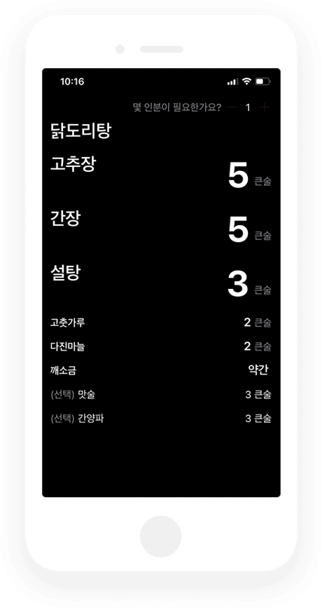 상세화면으로 들어가면 필수양념소스와 선택하는 양념소스를 구분해서 자신에게 맞게 소스를 만들수 있어요. 특히 정량으로 표시되어서 누구나 쉽게 만들수 있고, 몇인분을 만들지 선택하면 그 만큼 자동으로 정량이 계산되기때문에 소량 혹은 대량으로 만들때도 편해요.