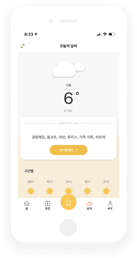 오늘의 코디는 날씨변화에 따라서 팁을 알려주기도 해요. 그날 날씨나 온도에 따라서 옷을 추천하는데 날씨가 흐리고 온도가 낮으면 경량패딩, 울코드, 야상, 후리스, 가죽의류, 히트텍등을 추천해줘서 어떤옷을 입어야할지 고민하는분들에게 도움을 줘요.