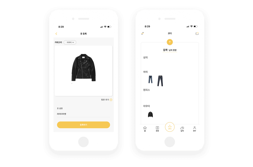 편집이 끝나면 간단한 옷설명을 하고 등록하면 되요. 옷장속에 등록된 이미지들을 가지고 ‘코디’를 누르면 본격적으로 자신만의 코디북을 만들수 있어요. 가운데 옷장을 위로 슬라이드하면 등록한 옷사진들이 카테고리별로 보일꺼예요.