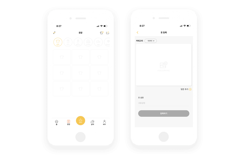 자신이 직접 코디북을 만들수 있는 ‘옷장’은 오른쪽 상단에 아이콘을 눌러서 등록할수 있어요. 카테고리를 먼저 선택하고, 네모박스안에 사진등록을 누르면 스마트폰 갤러리화면으로 이동해서 원하는 옷 사진을 선택하면되요.