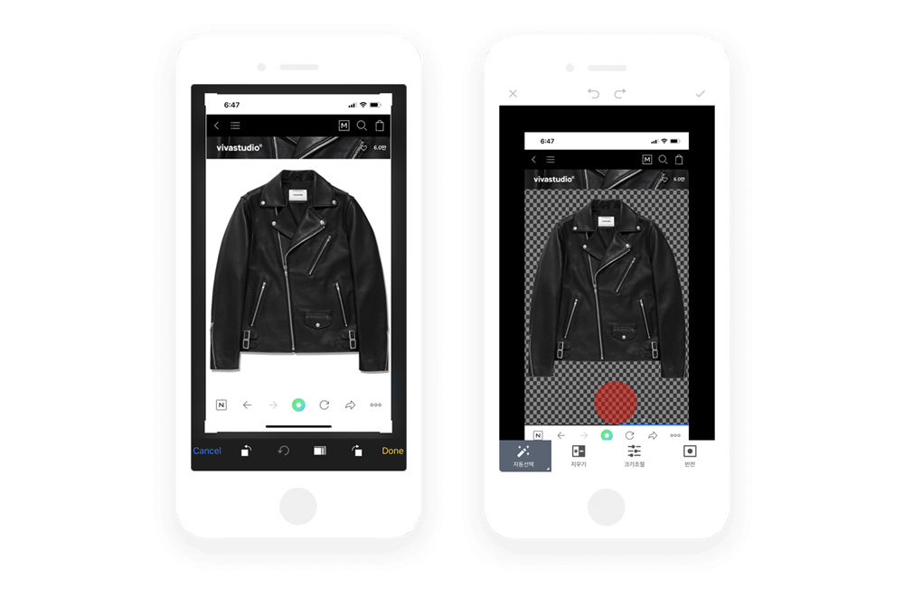 코디북에 등록하기위해 편집화면으로 이동한후 배경을 지워야하기때문에 자동선택, 수동선택중 선택해서 지워야해요. 이때 손가락으로 터치를 한 상태에서 지우고 싶은 배경을 슬라이드하면 지워져요. 포토샵같이 브로시 크기를 조절할수 있어서 쉽게 배경을 지울수 있어요.