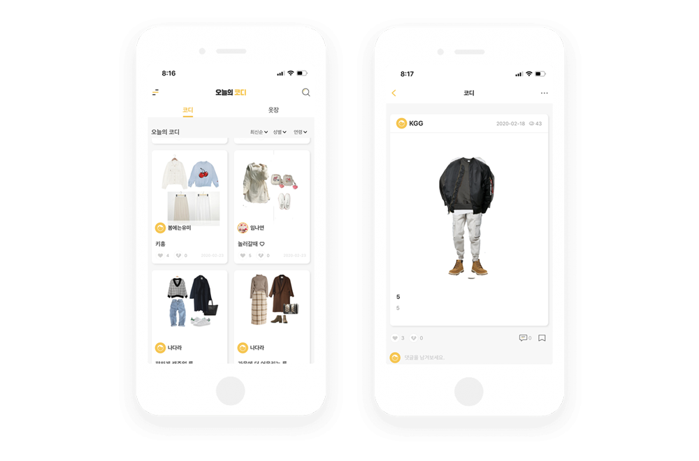 어플을 실행하면 다른사람들이 올려놓은 사진들을 볼수 있어요. 전부 코디북스타일의 사진들인데 마음에 드는 스타일은 의견을 적을수 있고, 카카오톡으로 공유도 할수 있어요. 성별과 연령별로 선택해서 볼수있기때문에 자신의 조건에 맞춰서 어떻게 옷을 입어야할지 참고할수 있어요.