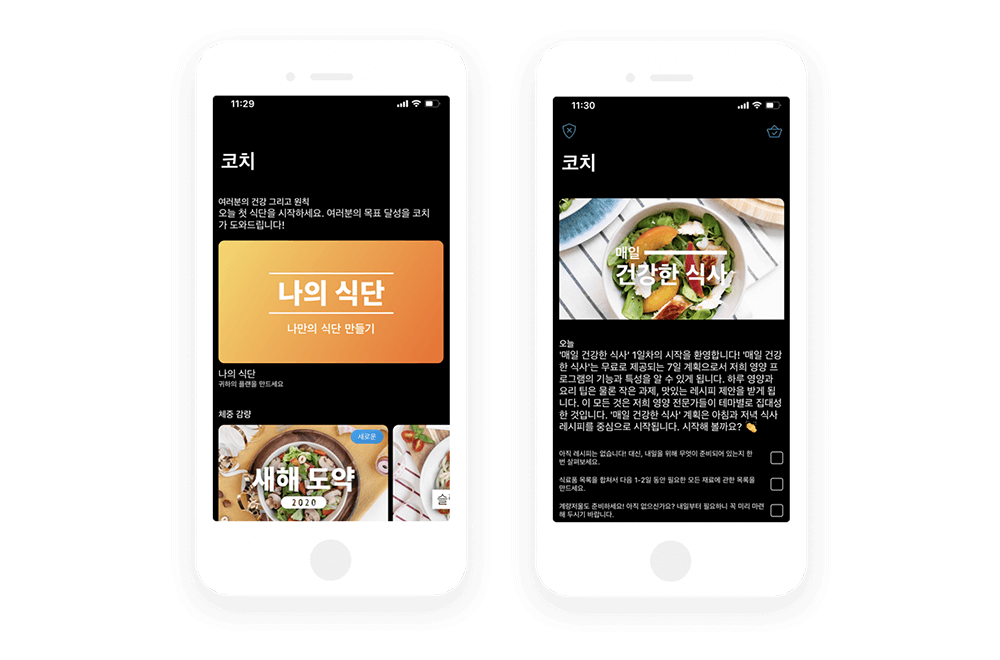 다음으로 코치라는 화면은 자신에게 맞는 방법중에 하나를 선택해서 요리 레시피와 과제를 정해서 클리어하는 기능이예요. 무료 사용자들은 건강한 식사 한가지만 선택이 가능해요. 앱에서 매일매일 제시하는 목표 리스트를 하나씩 지워서 목표를 달성하는거예요. 전체적으로 화면이 깔끔하고 UI도 간편해서 누구나 쉽게 사용할 수 있어서 좋은거 같아요.