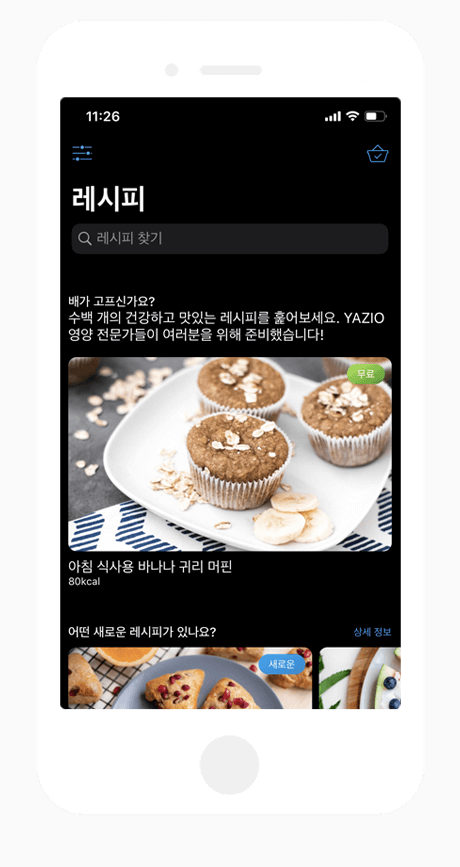 레시피화면은 간단하게 요리할수 있는 건강한 음식을 야지오 앱이 알려줘요. 요리 난이도와 시간, 칼로리를 확인할 수 있고 추가로 돈을 지불하면 레시피를 알려줘서 매일같이 닭가슴살이나 샐러드 등 맛 없는 식단을 먹는 분들에게 조금은 맛있고 건강하게 체중감량을 할수 있게 도와줘요.