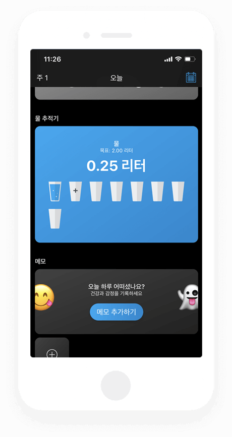 다음으로 활동내역을 알수 있어요. 활동내역은 만보기 기능을 연결하거나 아이폰의 건강기능을 연결할수 있어요. 추가로 각종 운동을 연결해서 소비된 칼로리를 확인할수 있어요. 그 밑으로 현재 체중과 섭취한 물의 양을 기록할수 있어요.