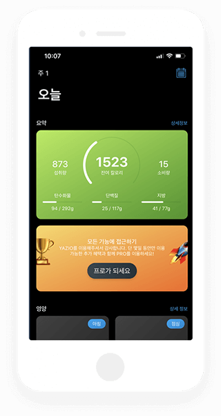 음식 앞에서 칼로리 계산을 쉽게 해주는 앱이 있다면 다이어트가 좀 더 편해지겠죠? 많고 많은 앱 중에서 처음 소개하는 앱은 야지오(YAZIO)예요. 먼저, 앱스토어에서 야지오를 검색해서 다운을 받고 회원가입을 해요. 첫 화면은 다이어리 화면이예요. 오늘 하루 요약정보를 한눈에 확인할 수 있고, 먹은음식과 활동을 입력할수 있어요.