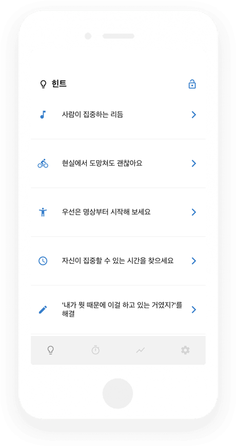 공부타이머 Focusi는 시간을 재는 타이머기능과 시간을 어떻게보냈는지 통계를 확인하는 기능으로 나뉘어져있어요. 메뉴는 총 4개로 구성되어있는데 힌트, 타이머, 기록, 설정으로 실제 이용하는 메뉴는 타이머, 기록, 설정이예요. 힌트는 말 그대로 어플을 이용하는 팁을 설명하는 메뉴예요.