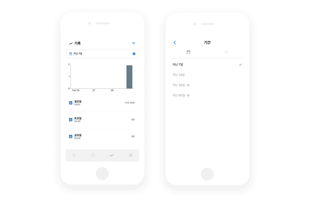 기록은 공부타이머를 실행한 시간과 종류를 그래프로 확인할수 있는메뉴예요. 기간은 7일, 14일, 30일, 90일로 검색할수 있고, 어떤일을 했는지 태그로 검색할수 있어요. 설정은 어플의 세부기능을 설정할수 있어요.