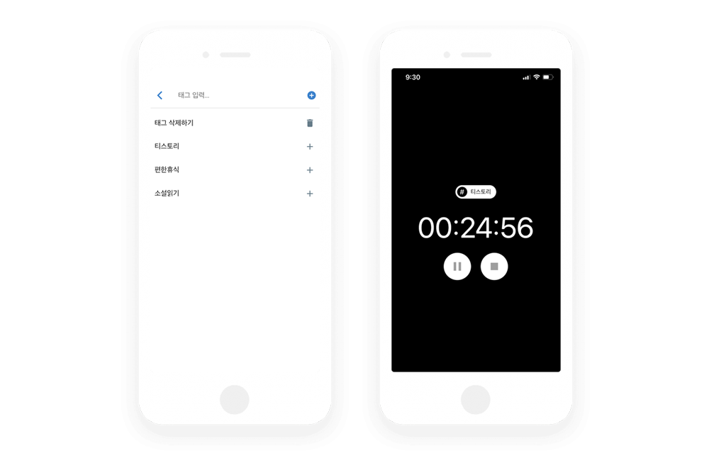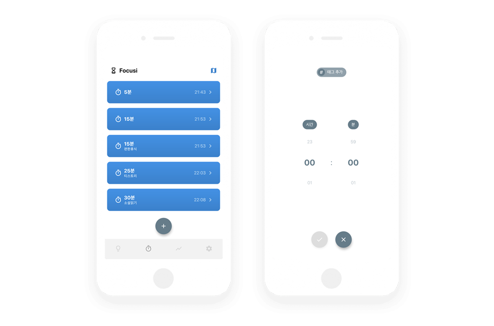 타이머는 실질적으로 시간을 어떤목적으로 이용할지 등록하고 실행하는 메뉴예요. 아래쪽 가운데 +버튼을 누르면 태그추가와 시간을 새로 등록할수 있어요. 태그는 시간의 목적을 간단하게 적어서 이후 같은 목적으로 시간을 등록할때 다시 쓸수 있어요. 시간을 입력하면 타이머 화면에 등록이 완료되요.