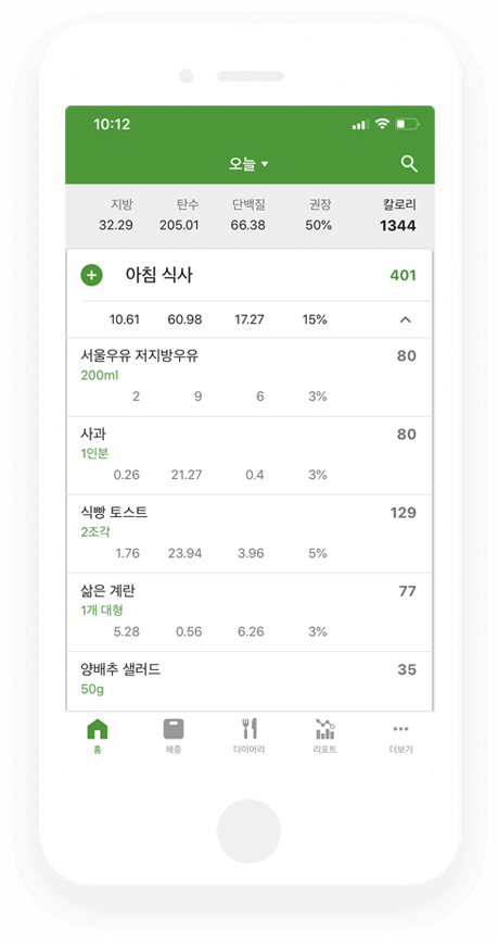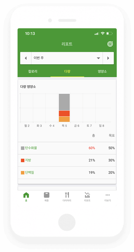 오늘, 어제, 이번 주, 지난주 어떻게 식단을 먹었는지 칼로리 변화와 탄수화물, 지방, 단백질의 양과, 영양소의 비율을 세세하게 알려줘서 그동안 어떻게 다이어트를 하고 있는지 확인할 수 있어요.