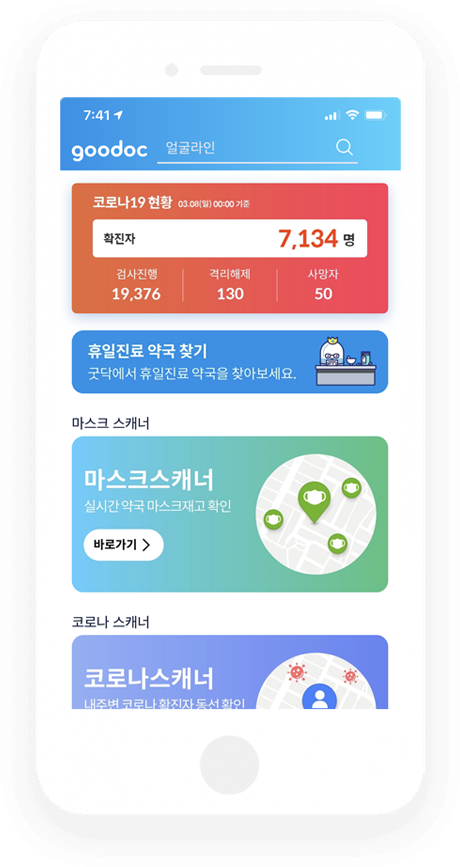 현재 이글을 작성하는 3월8일 기준으로 확진자는 7,134명, 사망자는 50명, 격리해제는 130명이고, 검사진행은 19,376명이예요. 포털사이트에서 확인할수 있는데 ‘굿닥’에서도 코로나현황을 확인할수 있어요.