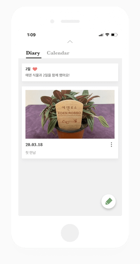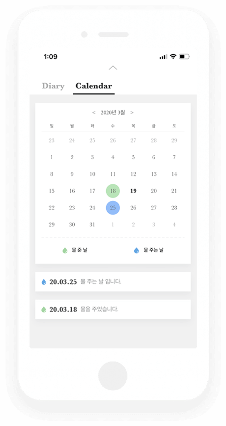 등록된 식물을 선택하면 물을 줘야 하는 시기가 보이고, 아래에서 위로 슬라이드 하면 다이어리를 쓸 수 있어요. 사진을 찍고, 간단한 코멘트를 적을 수 있어요. 캘린더 기능도 있기때문에 언제 물을 줬고, 물을 줘야하는지 한눈에 파악할 수 있어요.