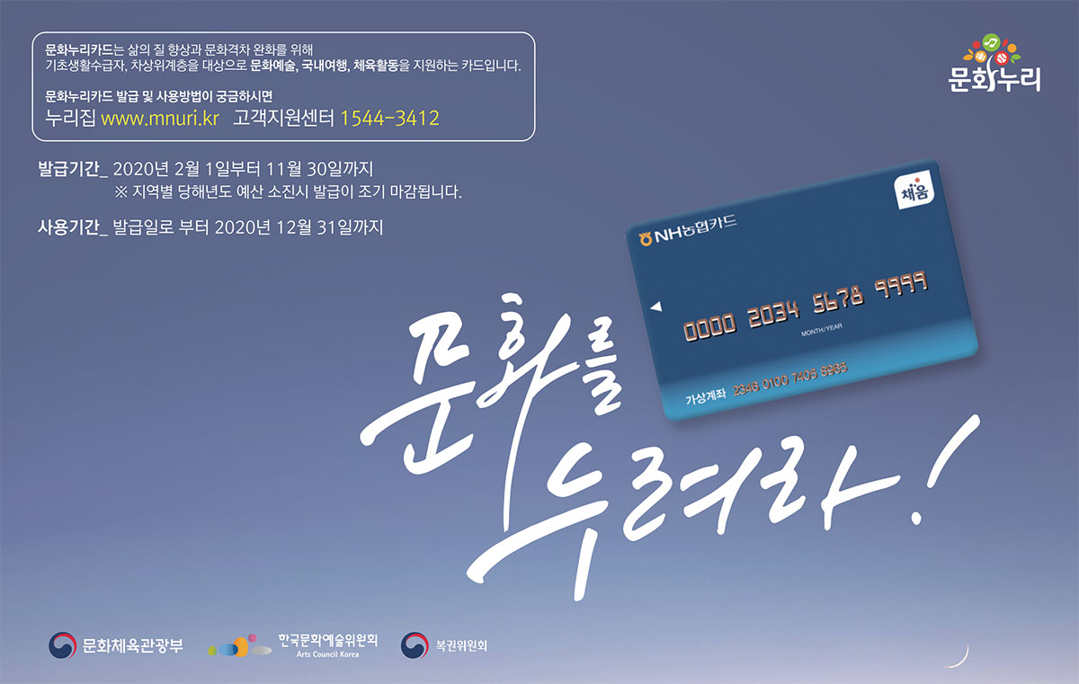 문화누리카드는 2020년 2월1일(토)부터 온라인(www.mnuri.kr), 전화(ARS) 재충전 발급을 시작했고, 2020년 2월3일(월)에 전국 주민센터에서 발급하기 시작했어요. 지역별로 예산이 소진되면 마감되기 때문에 신청하려면 서둘러야 해요. 카드 사용기간은 카드 발급일로부터 2020년 12월31일(목)까지 사용할 수 있어요.