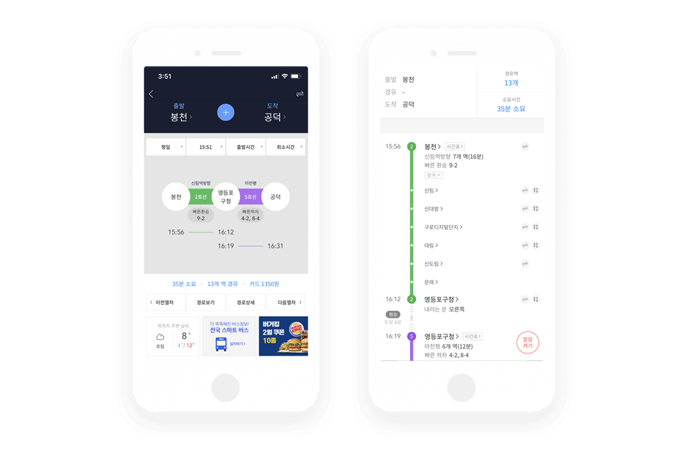 지하철종결자의 핵심 기능을 한 가지 꼽자면 ‘알림’기능을 꼽을 수 있어요. 퇴근 후 약속이 있다고 가정해볼께요. 빠른 검색으로 출발, 경유, 도착역을 검색해서 빠른 환승을 위해 플랫폼 번호와 걸리는 시간, 경유역, 교통비를 확인해요.
