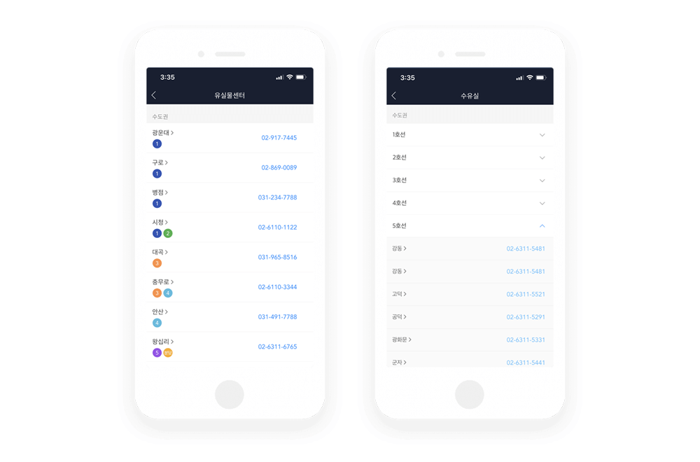 상단 메인메뉴 옆에 히든 메뉴를 클릭하면 현 위치, 유실물, 수유실, 실시간, 민원신고, 설정 메뉴가 있어요. 현 위치는 현재 자신의 위치를 지도로 표시해서 지하철역 위치를 빠르게 찾을 수 있어요. 유실물 센터와 수유실은 말 그대로 물건을 잃어버렸거나 아기들을 위한 수유실이 필요할 경우 사용할 수 있는데, 바로 번호를 눌러서 전화를 걸 수 있어서 편해요.