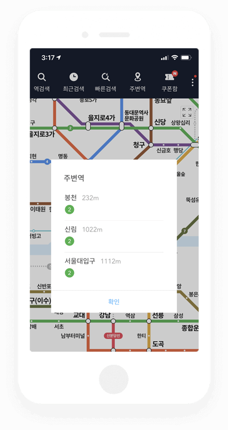 ‘지하철종결자’는 상단에 주요 메뉴들이 있고, 가장 중요한 지하철 노선이 화면의 대부분을 차지하는 구성을 가지고 있어요. 주요 메뉴로는 역 검색, 최근 검색, 빠른 검색, 주변 역, 쿠폰함이 있어요.